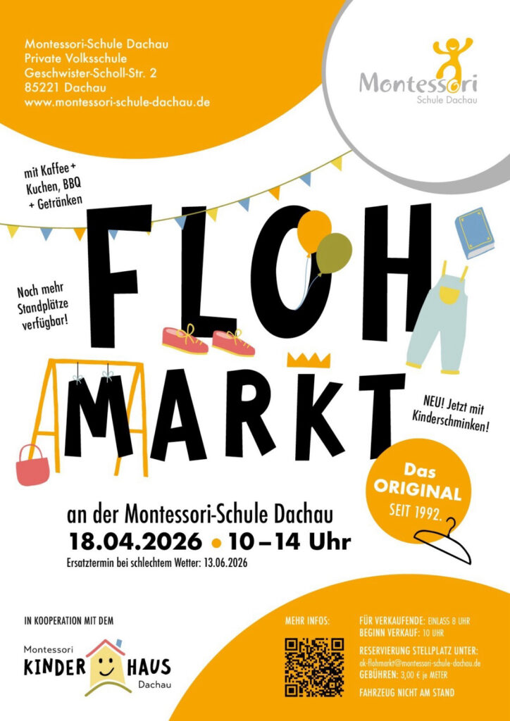 Der nächste Flohmarkt findet am Samstag, den 18. April 2026, von 10 bis 14 Uhr statt. Verkäuferinnen und Verkäufer können ab 8 Uhr zum Aufbau auf das Gelände fahren. Standplätze müssen vorab beim AK Flohmarkt (ak-flohmarkt@montessori-schule-dachau.de) reserviert werden.